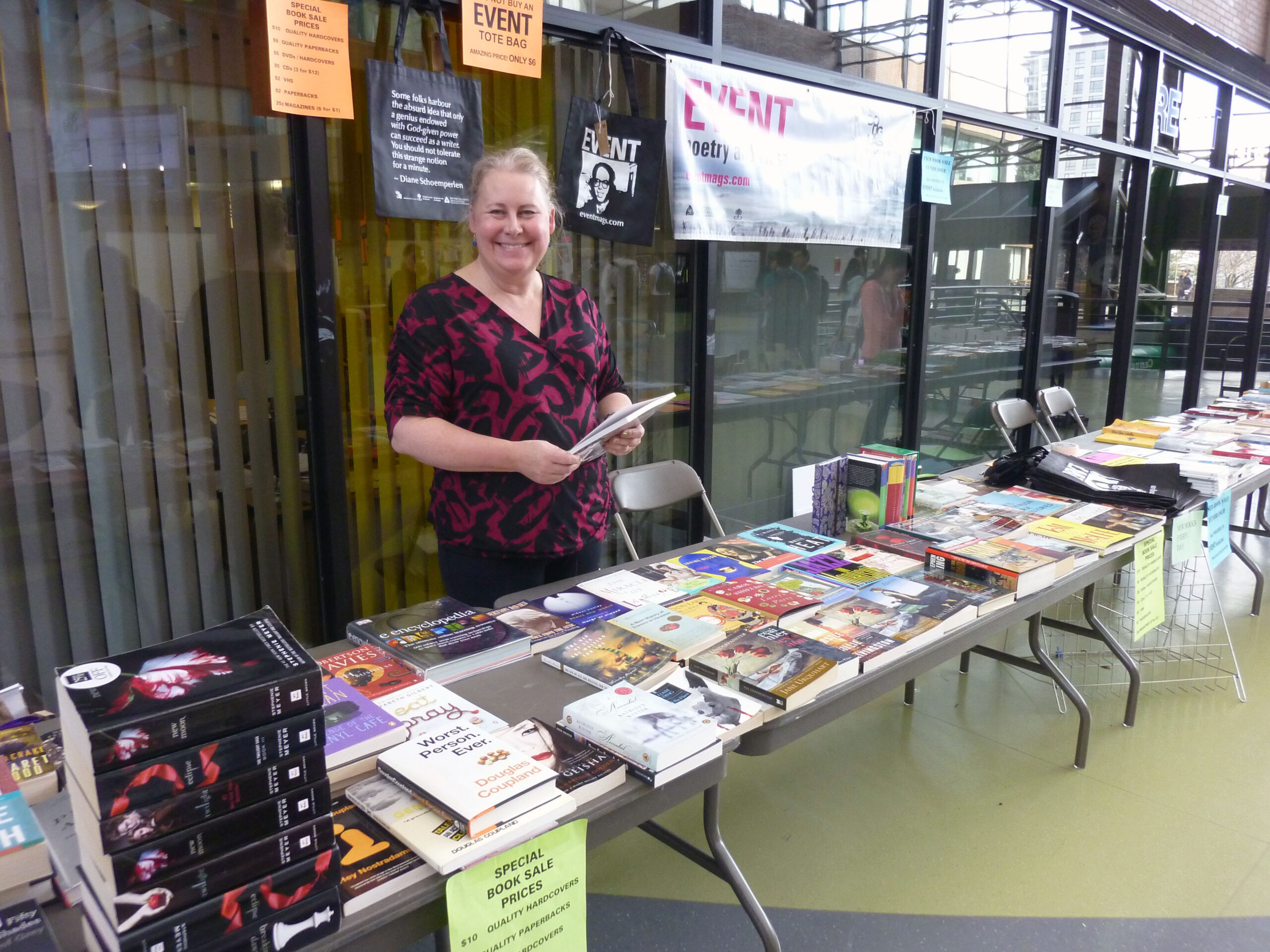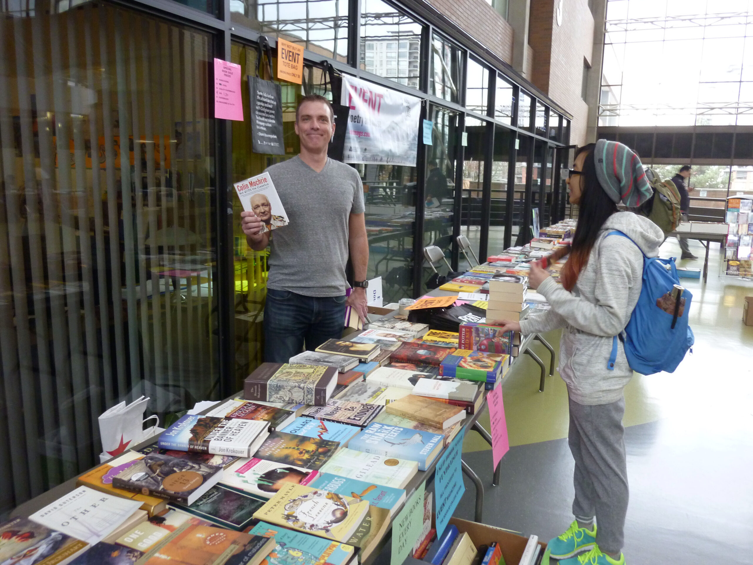 EVENT’s Annual Fundraising Book Sale took over the Douglas College Concourse last week with a dazzling—no, stupefying—number of books: books in rows on tables, books lined up in boxes, books on rolling carts, books spilling from the hands of patrons as they gasped in disbelief at the selection and the low, low prices! We had books in every colour, books in every genre, ranging from the literary to the strange, Wayson Choy alongside Stephen King, macroeconomics texts right next to books on how to heal your soul…or how to avoid killing your houseplants.