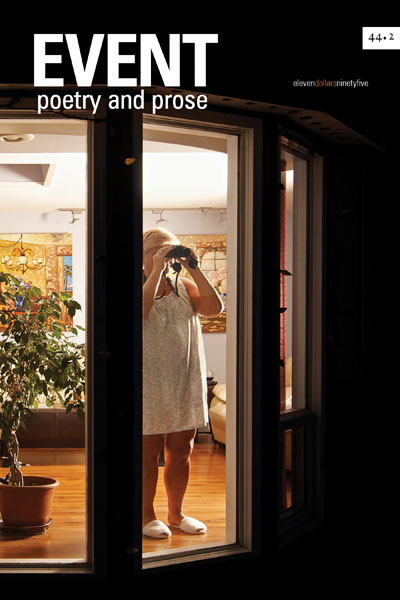 3. It suggests a theme, a distinct mood, and/or a narrative. While it’s impossible to predict the exact images the texts we print will contain, there are universal themes that tend to recur: loss, isolation, parenthood, childhood, journeys, silence, waiting, transformation. One of my favourite EVENT covers features Connor Charlesworth’s ‘The Couple (Watched/Watching)’ which won BlackFlash Magazine’s 2014 Optic Nerve contest. The photo tells a story, has dramatic contrast of light and dark, and depicts voyeurism while also relating an image of domesticity. On the back cover we included a call-out quote from Richard Kelly Kemick’s poem, ‘Wolves’: ‘They can hear your stomach churn, / smell the cavities in your molars, / see your pulse galloping into the soft parts of your neck. / There is no place they do not know you.’