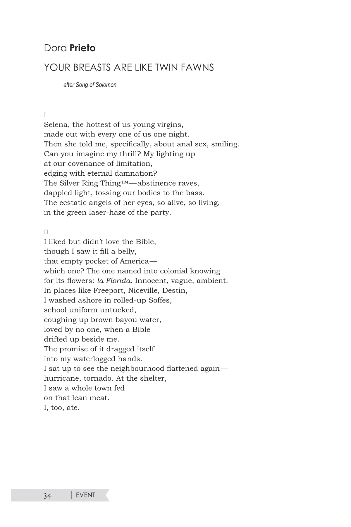 DORA PRIETO is a Vancouver-based poet and a 2025–27 Wallace Stegner Fellow at Stanford University. Her debut collection, Girl Tejido, is forthcoming with House of Anansi (April 2027). Her poems have appeared in Maisonneuve, Catapult, The Capilano Review and more. She is also co-translating JAWS by Xitlalitl Rodríguez Mendoza and is a member of El Mashup Collective.
